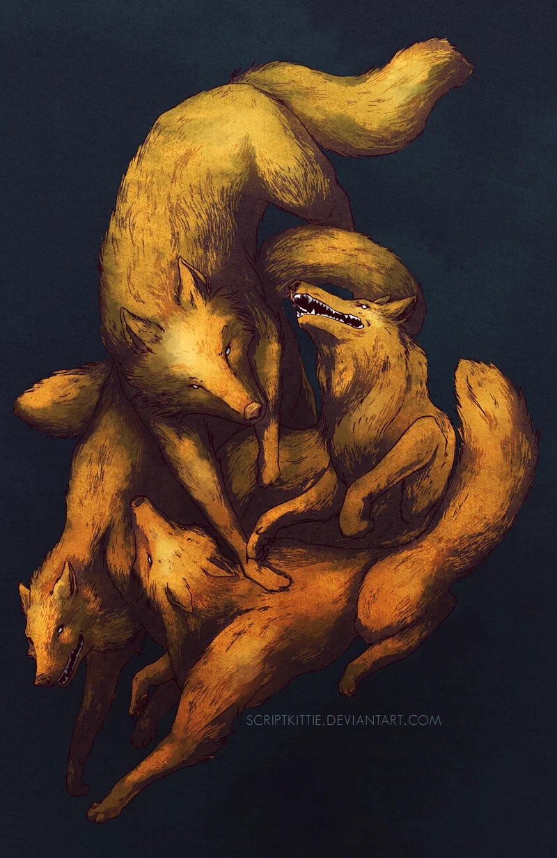 After the flat colors come in, I lock my layers and go to town with gradients and specific color combinations. I really like the contrast between yellow and indigo and felt like using that to build depth. In a similar vein, I typically like to use gradient washes to direct a change from the top to the bottom. Near the top, the image is very simple. As you start to see how the paws and heads are interacting between 4 different animals is where the picture gains complexity and a richer orange color.